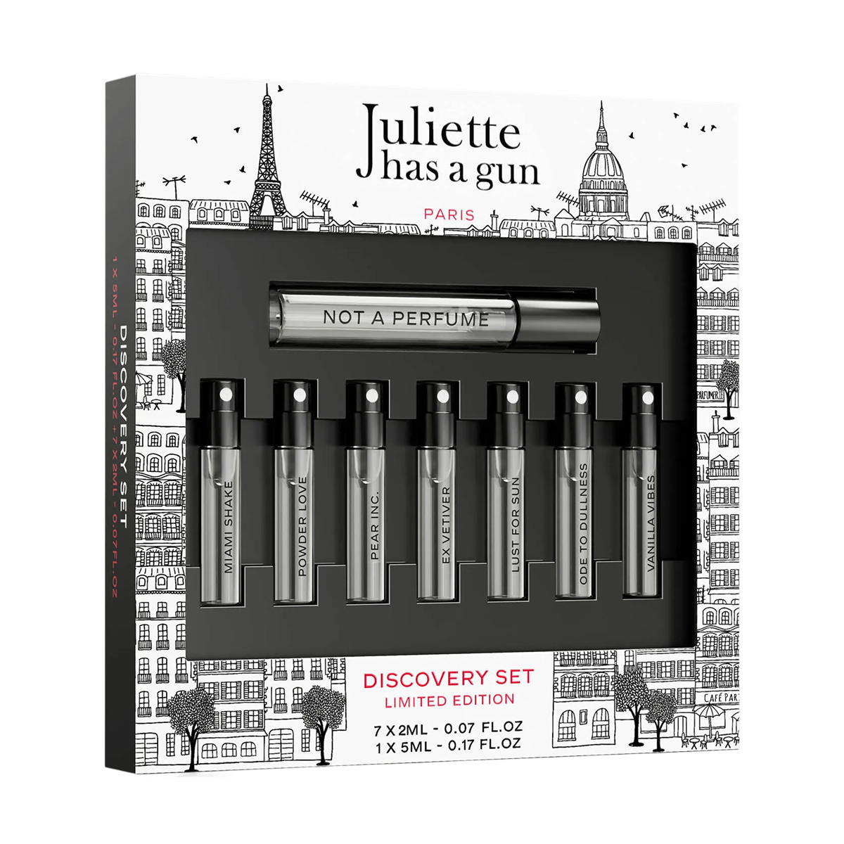 Набор включает культовый Not a Perfume в объеме 5 мл, а также миниатюры 1.7 мл ароматов Vanilla Vibes, Pear Inc., Lust for Sun, Ex Vetiver, Ode to Dullness, Miami Shake и новинку 2025 года – Powder Love.